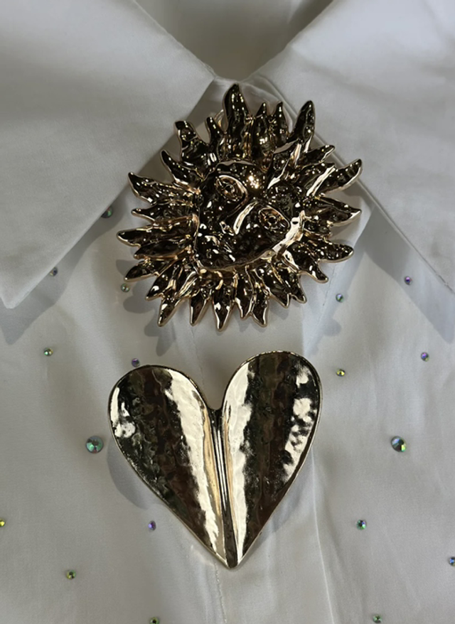 Die goldfarbenen Broschen (Herz, Sonne & Statement-Elemente) sind abnehmbar und machen die Bluse vielseitig tragbar: