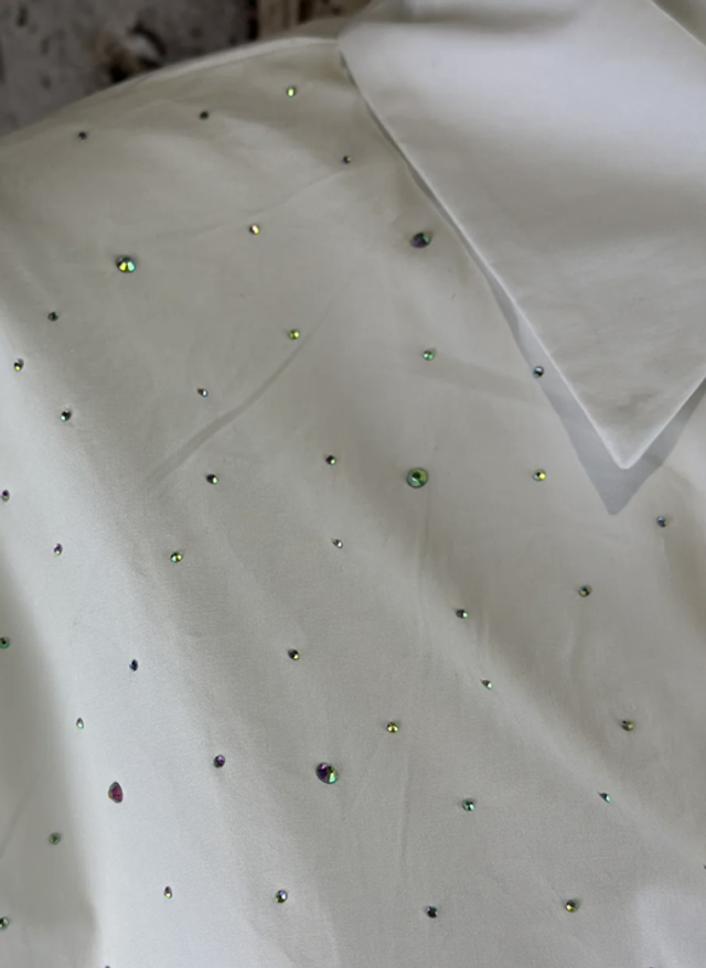 Elegante weiße Bluse mit funkelnden Strass-Steinen allover – dezent glitzernd und dennoch absolut besonders.