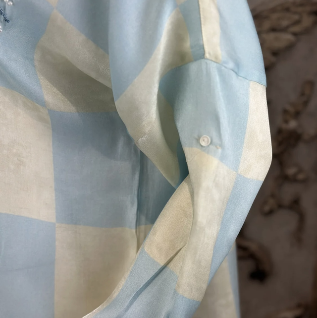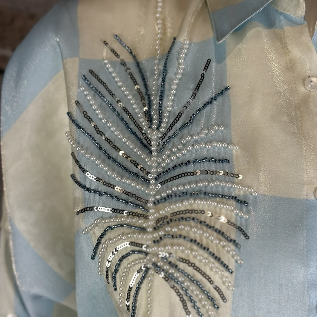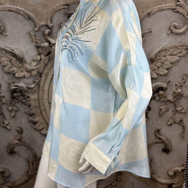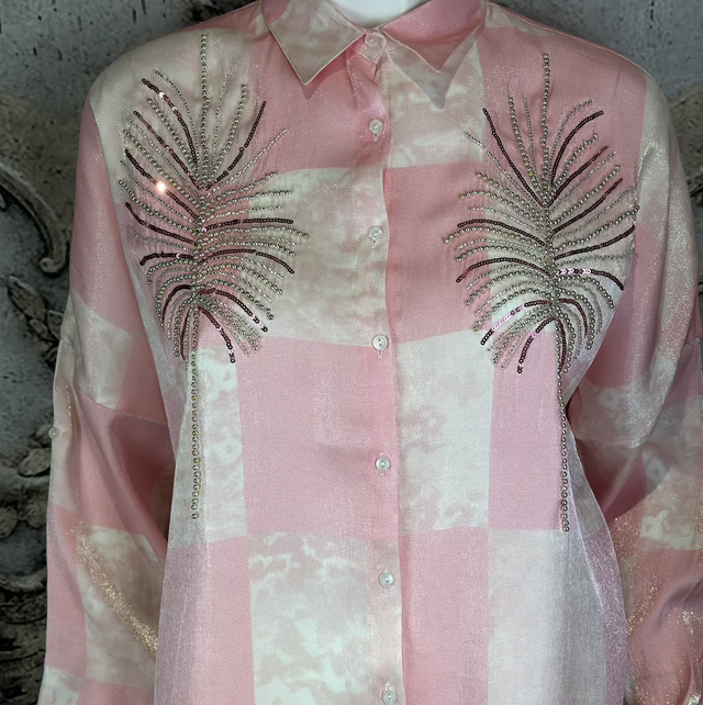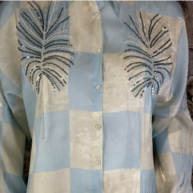 Diese elegante Bluse kombiniert ein angesagtes Karomuster mit einem luxuriösen Schimmer-Effekt. Die Strass-Applikationen in Palmendesign sorgen für ein glamouröses Finish. Dank des lockeren Schnitts und der leichten, fließenden Qualität trägt sich die Bluse angenehm und schmeichelt jeder Figur. Ob lässig zur Jeans oder chic kombiniert – ein echter Hingucker für jede Gelegenheit! Verfügbar in mehreren Farben.