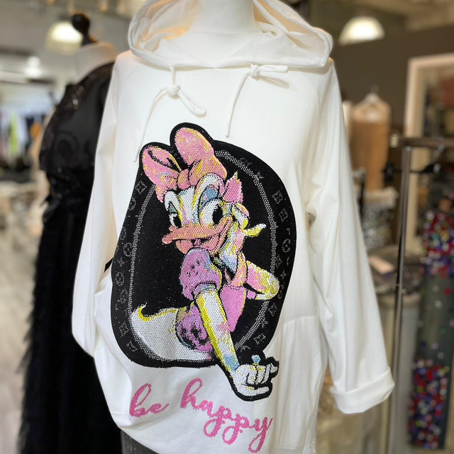 Für alle Cartoonisten- super schönes Kapuzenshirt mit Einschubtaschen und Kapuze. Daisy und Schriftzug „be happy“ komplett aus Glassteinchen.