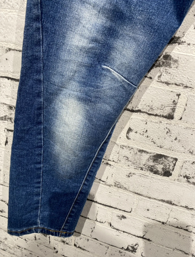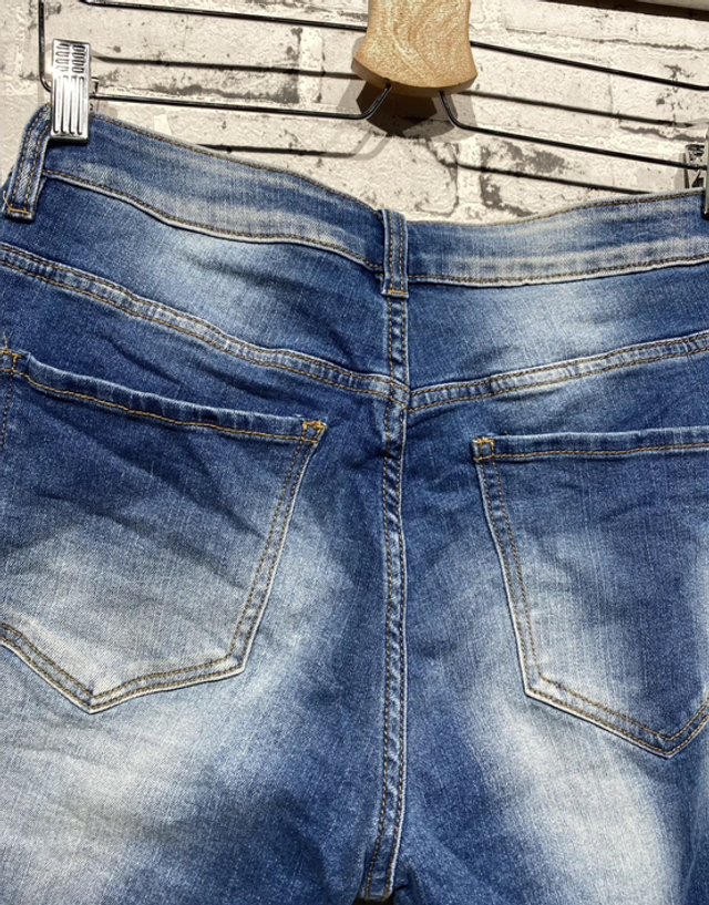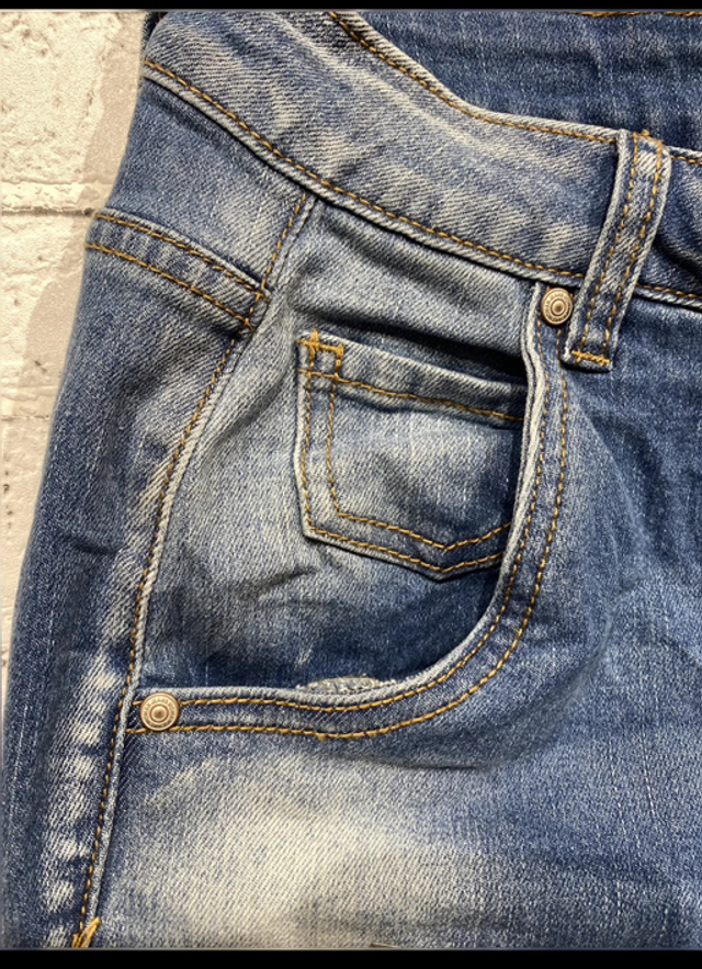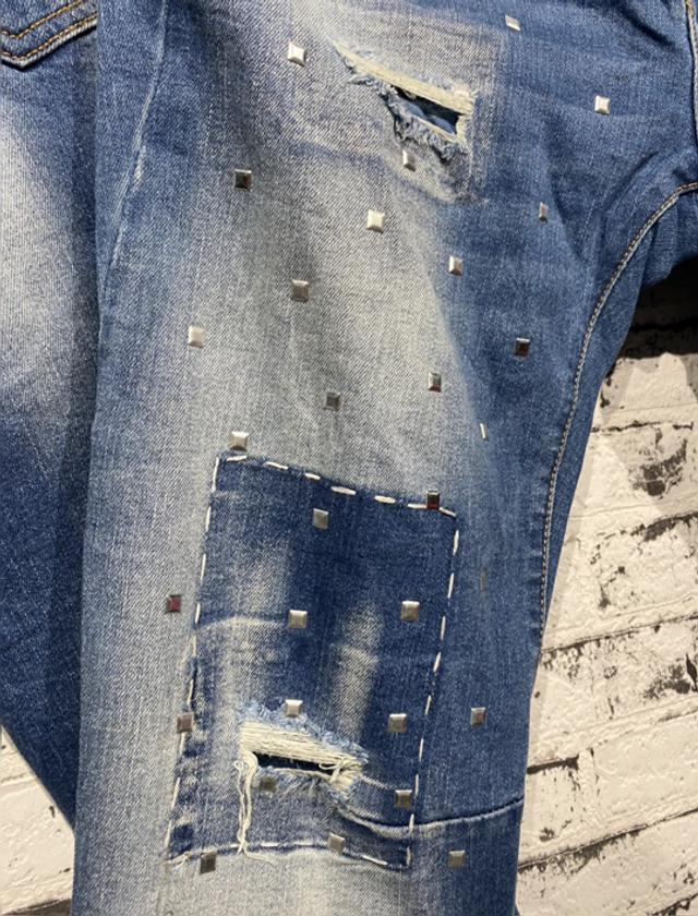 Stylische Jeans in Used-Optik mit auffälligen Destroyed-Details und funkelnden silberfarbenen Nieten auf der Vorderseite. Diese Hose vereint Komfort und Coolness, ideal für moderne Alltagslooks. Zwei Gesäßtaschen runden das Design ab.