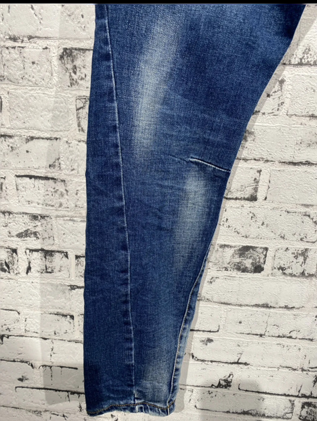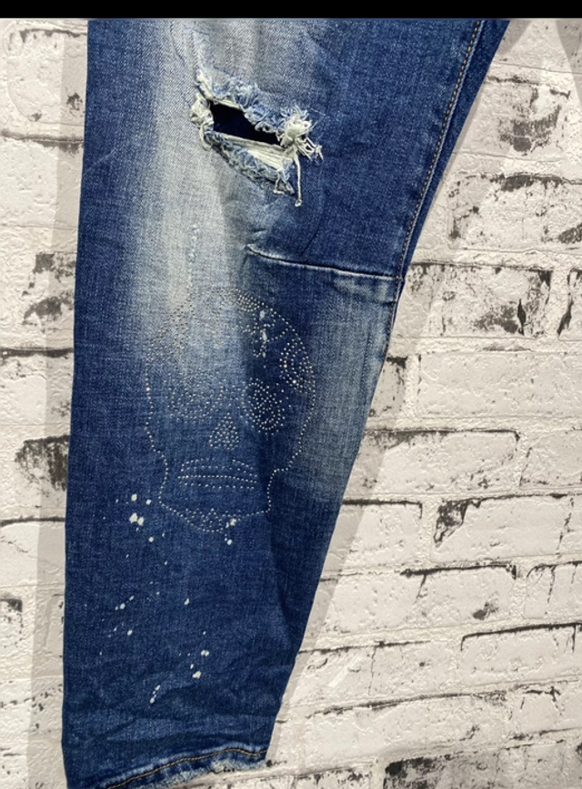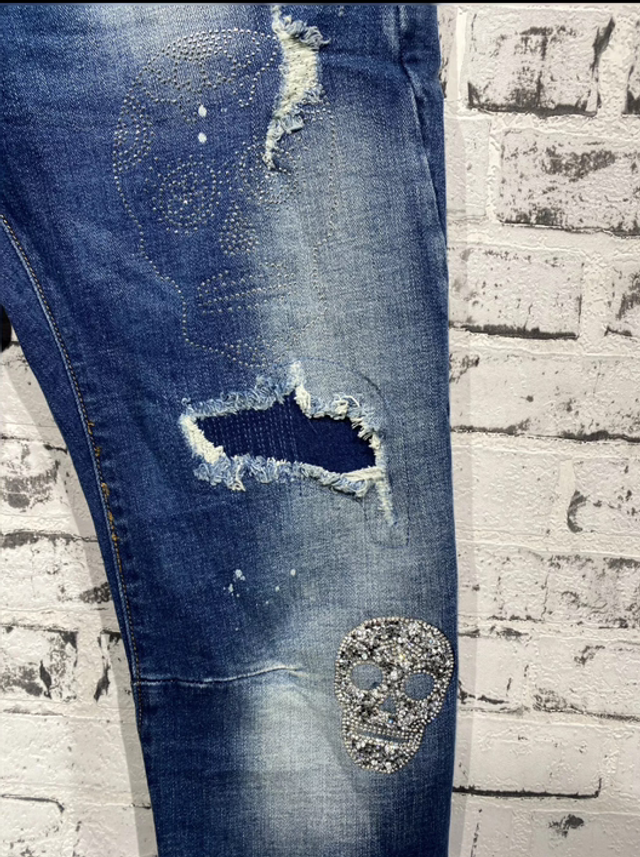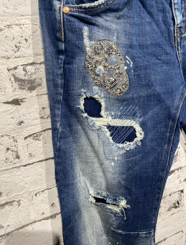Trendige Boyfriend-Jeans mit auffälligen Totenkopf-Applikationen aus funkelnden Glitzersteinen und angesagtem Destroyed-Look. Die Jeans kombiniert Komfort mit Stil und ist ein echter Hingucker. Ausgestattet mit zwei Gesäßtaschen und einem klassischen 5-Pocket-Design. Perfekt für rockige und lässige Outfits.