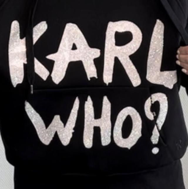 Toller Kapuzen-Sweatshirt „Karl-Who?“ Warme Qualität. Mit schönem Glitzersteinchen- Schriftzug. Kängurutasche und Kapuze. schwarz Onesize A-A Maß ca. 69 cm Länge ca. 69 cm Material: 70% Baumwolle 30% Polyester ! Wir übernehmen keine Garantie auf Glassteinchen !