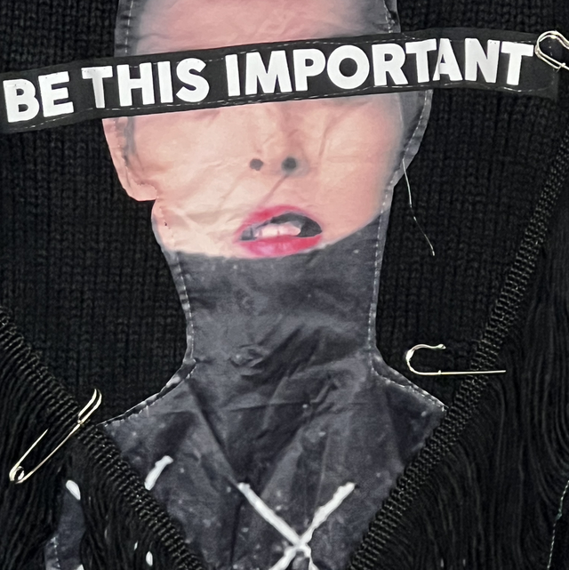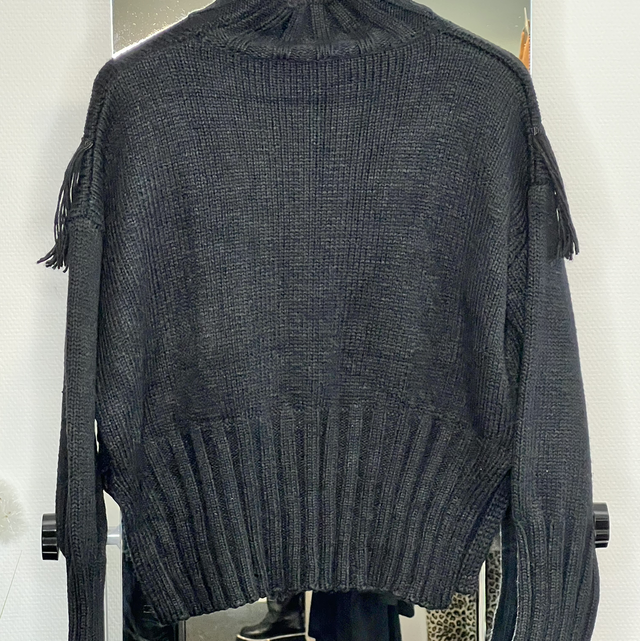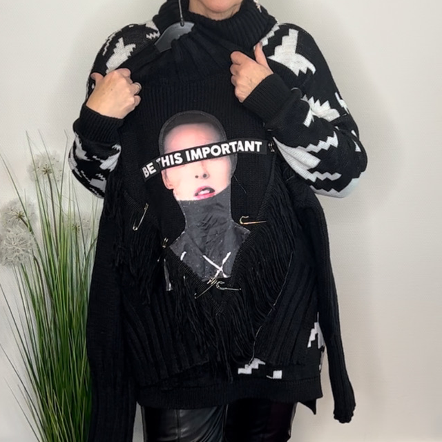 Kurz-Rollkragen-Pullover mit Bild, Fransen (vorne) und abnehmbaren Sicherheitsnadeln Farbe: schwarz Onesize A-A Maß ca. 71 cm Länge ca. 54 cm! Wir übernehmen keine Garantie auf Applikationen !